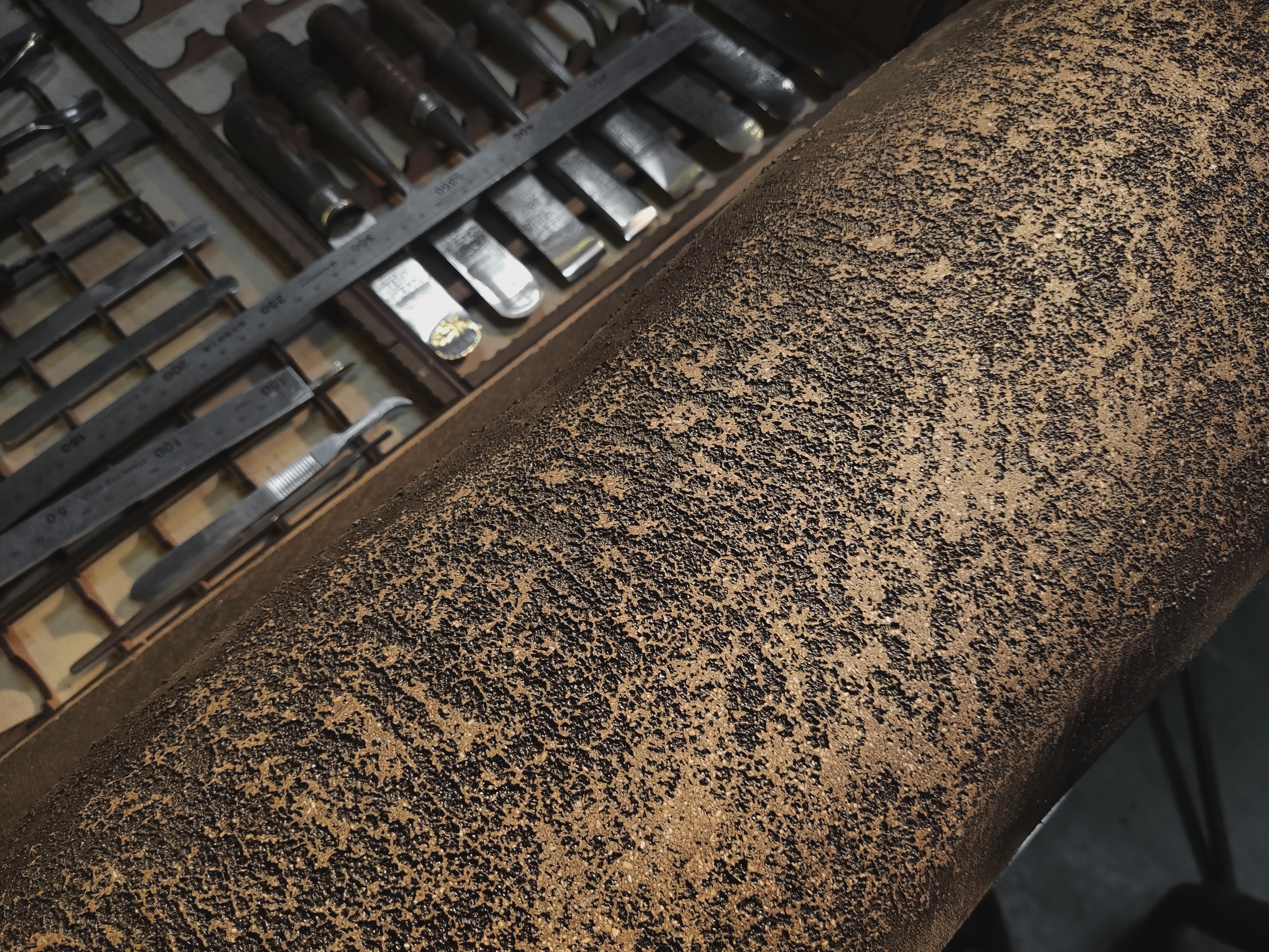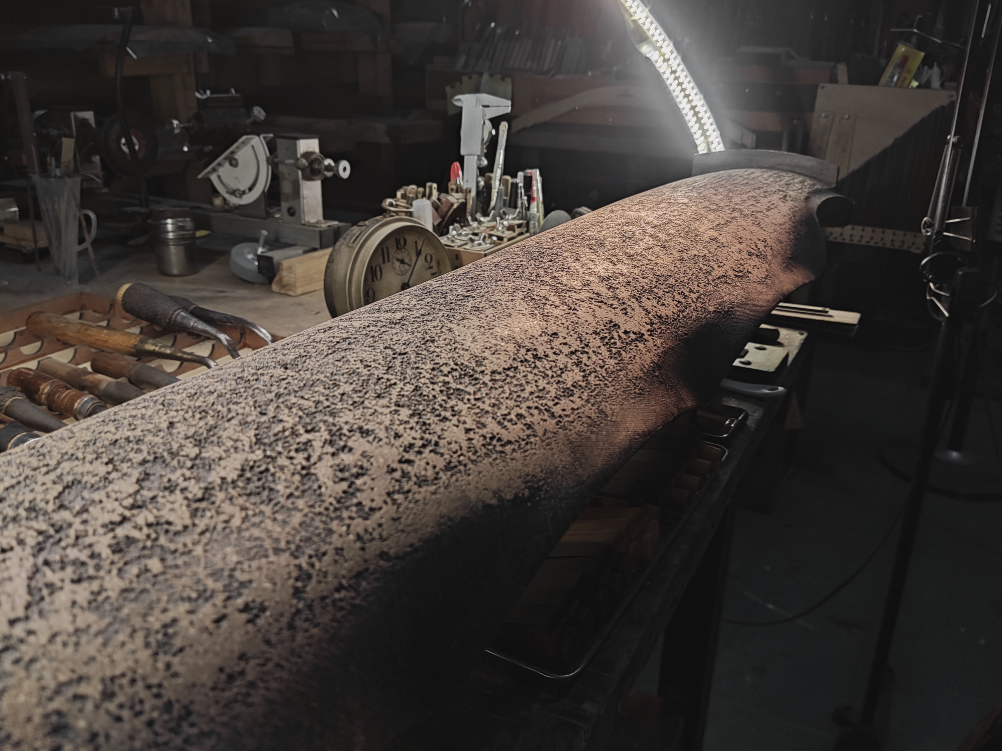 In the complete step of scraping the lacquer-mixture coating of the Jiaoye Qin, the key and difficulty lies in how to take into account the average thickness, retain details, smooth polishing, and especially the slight curved and angular details that are looming on the complex surface.