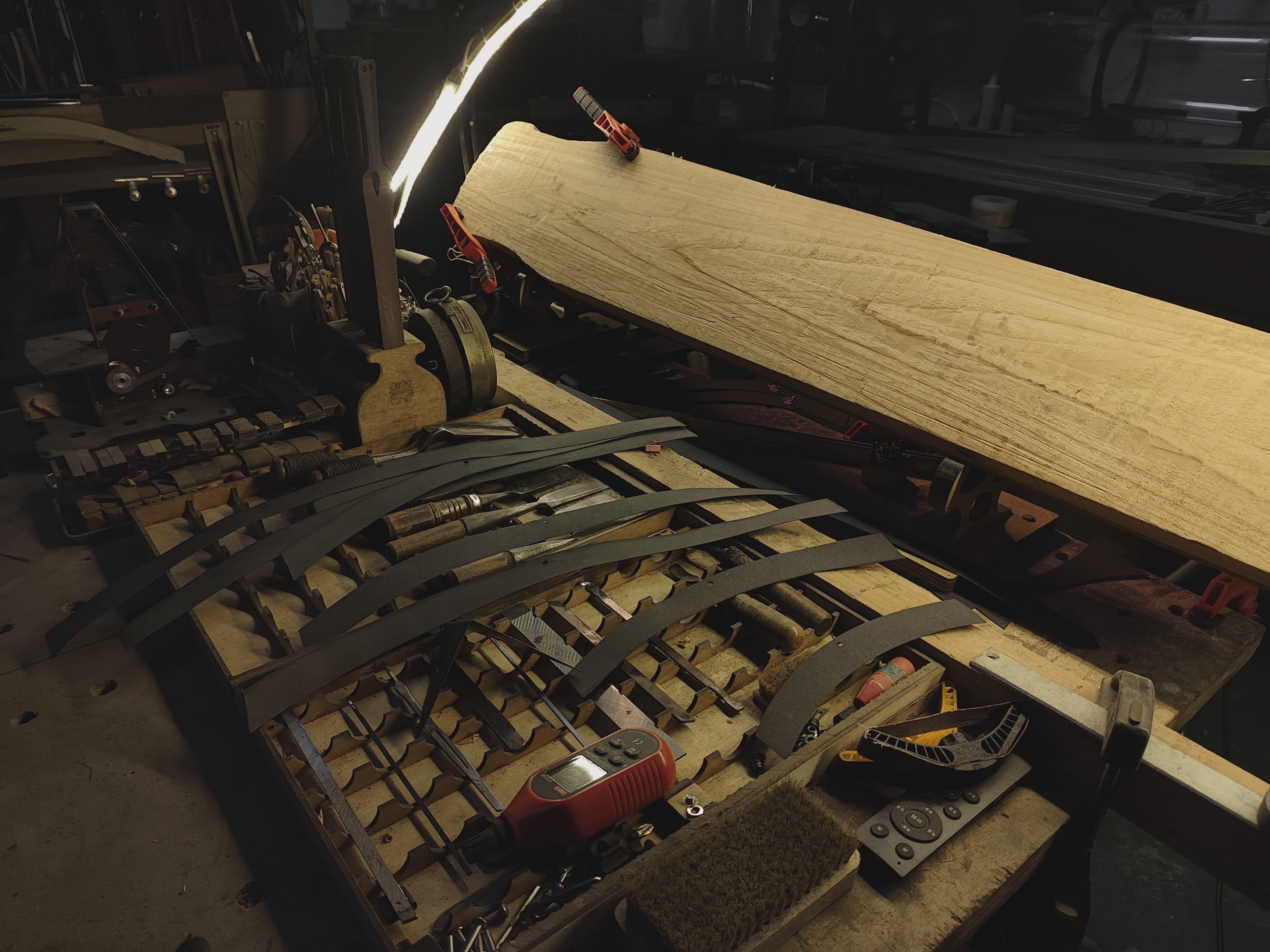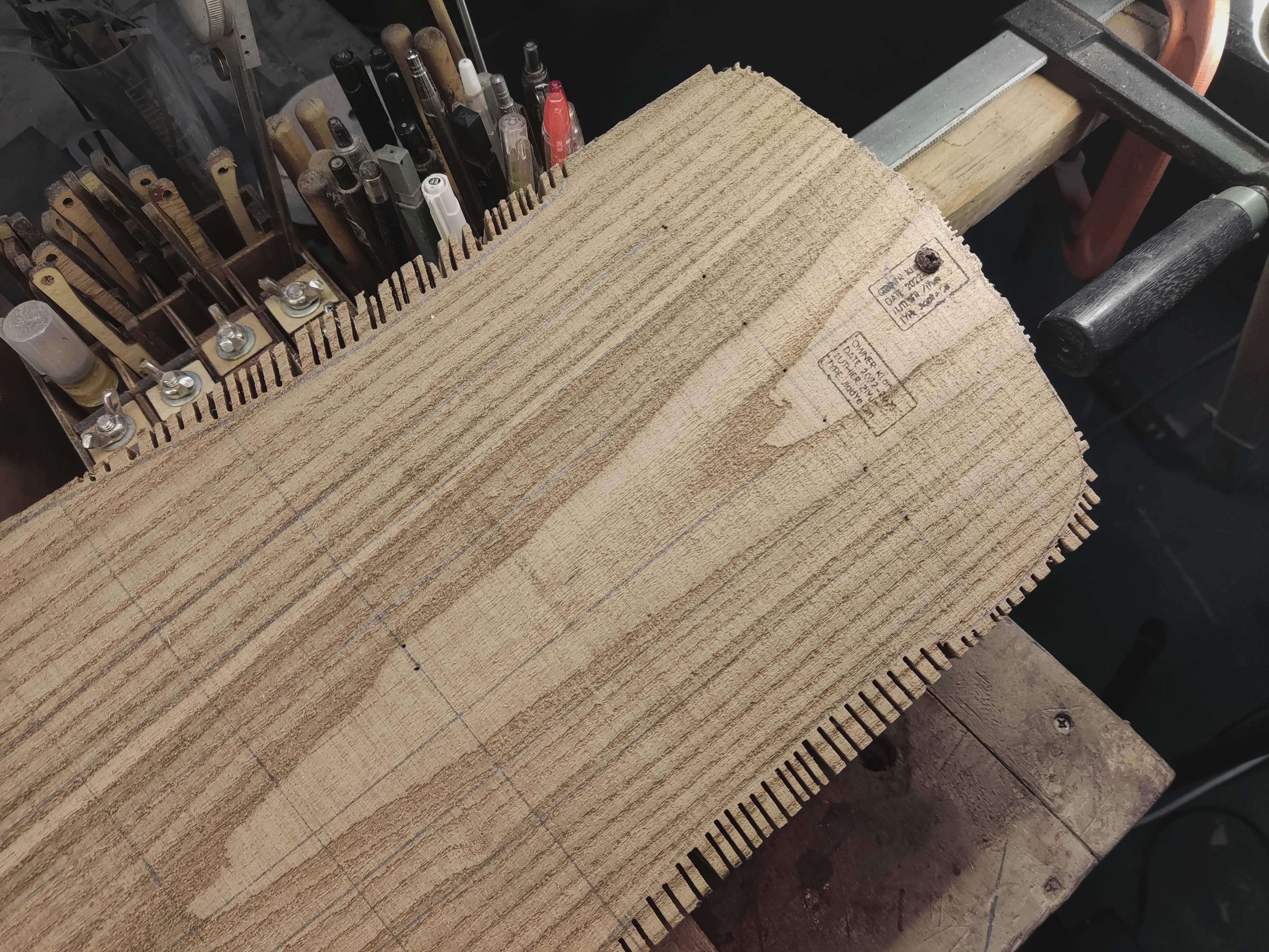 Usually, a small wooden mallet is used for tap-scanning, during the woods matching and cutting, and the tapping-sound is used for rapid diagnose various sections and deep layers, so as to avoid the potential cracks in the cutting materials. And at the same time, Cross-comparison of soundboards that match each other in the multi combination.